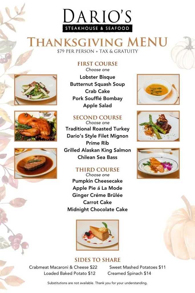 Dario’s Steakhouse & Seafood will offer a refined three-course menu on Thursday, November 27, 2025, from 11 AM to 7 PM, priced at $79 per person (plus tax and gratuity). Guests will begin their Thanksgiving meal with their choice of Lobster Bisque, Butternut Squash Soup, Texas Roasted Quail, Seafood Cake, or Winter Salad.