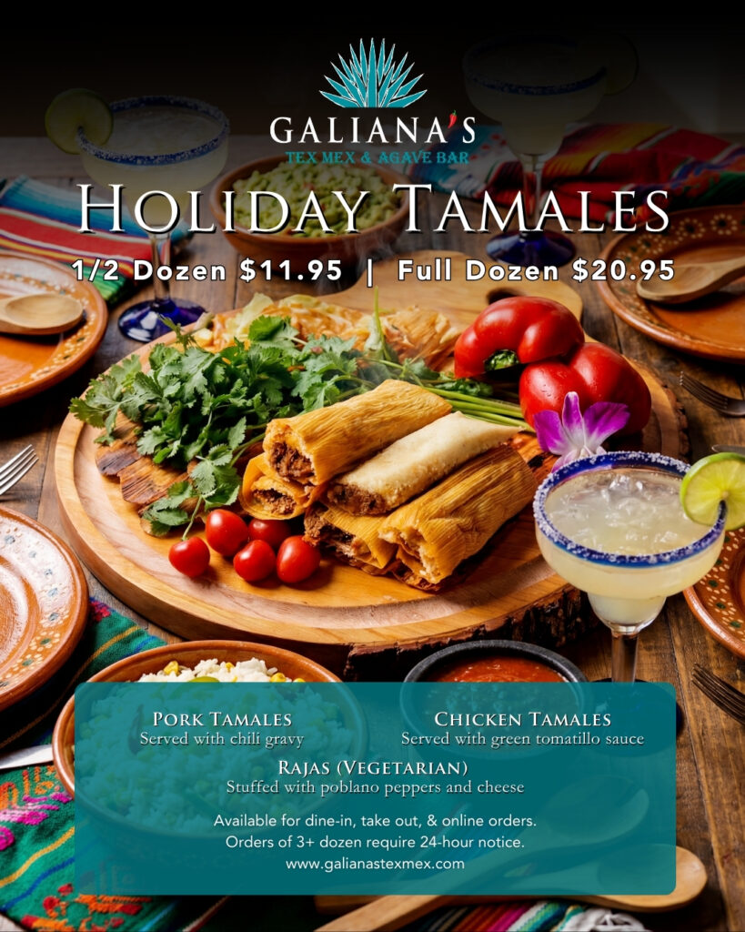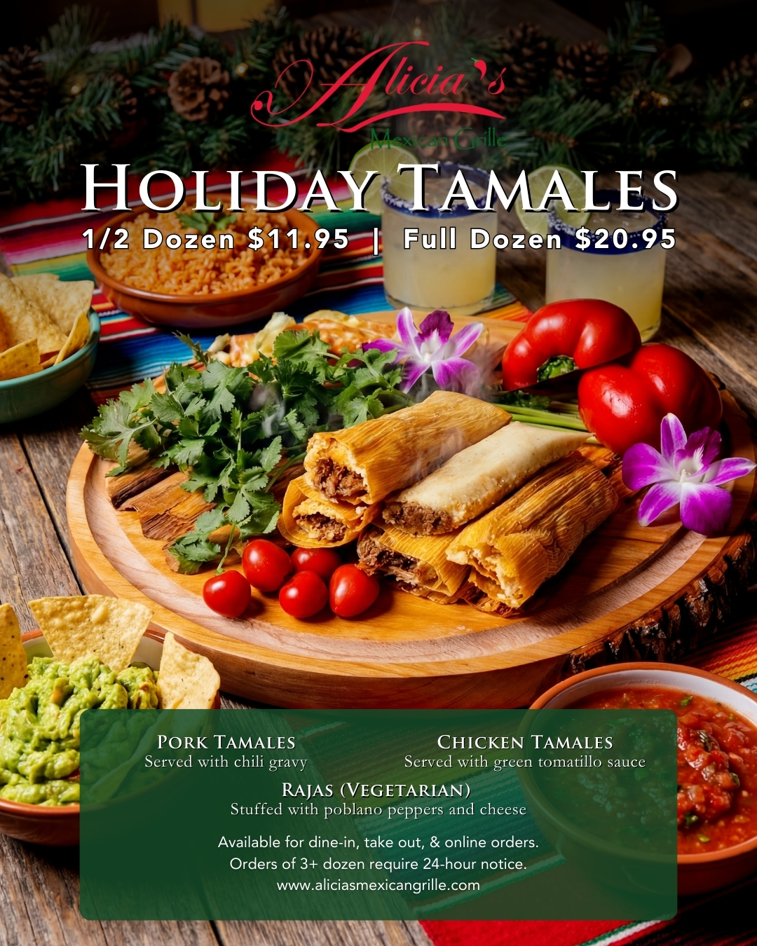 Alicia’s Mexican Grille – Alicia’s Mexican Grille Homemade Tamales – Now Tamale season has officially arrived at Alicia’s Mexican Grille, bringing holiday comfort at its best with Pork Tamales topped with chili gravy, Chicken Tamales with green tomatillo sauce, and delicious Rajas tamales stuffed with poblano peppers and cheese. Enjoy a ½ dozen for $11.95 or a full dozen for $20.95, available for dine-in, takeout, and online orders, and if you’re feeding the whole family, orders of 3+ dozen just need a 24-hour notice. Place your holiday tamale order today. Learn More & Order