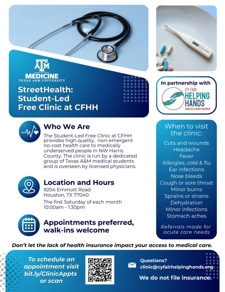 Cy-Fair Helping Hands (CFHH) is proud to announce a landmark partnership with the Texas A&M School of Medicine to launch StreetHealth, a new monthly medical student-led and physician supervised clinic. Scheduled to begin operations on February 7, 2026, this initiative aims to provide essential medical services and health education to the underserved and uninsured community in a welcoming, accessible environment.