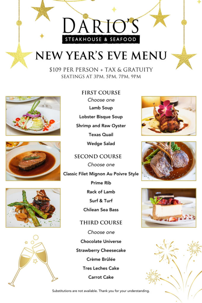 Seatings are available at 3 PM, 5 PM, 7 PM, and 9 PM. Reservations are required. To-go orders may also be placed by calling 281-304-1825. For full details, please visit Dario’s New Year’s Eve Menu.