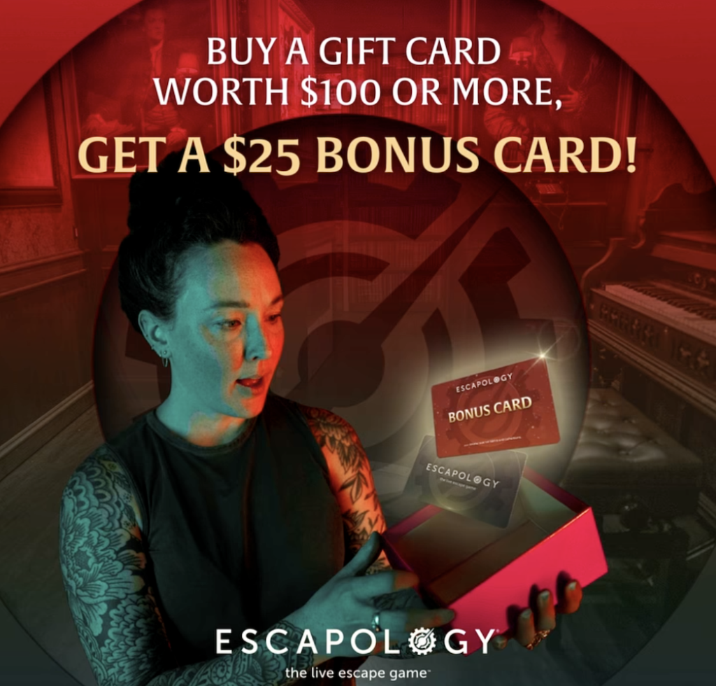 Escapology Escape Rooms – Buy a gift card worth $100 or more to our 5-star escape rooms, receive a $25 bonus card absolutely FREE! That means even MORE escape room fun on the gift your friends and loved ones will still be talking about NEXT holiday season. Purchase Online Gift Cards