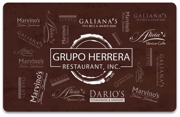 Grupo Herrera Restaurant Inc.– A Grupo Herrera gift card is the perfect surprise for your favorite food lover and can be used at any of the Grupo Herrera restaurants. Pick up a gift card during your next visit to any of our locations or purchase it online below. Current gift card promotional offers are only valid on in-restaurant gift card purchases (not valid on online purchases). Purchase Online Gift Cards