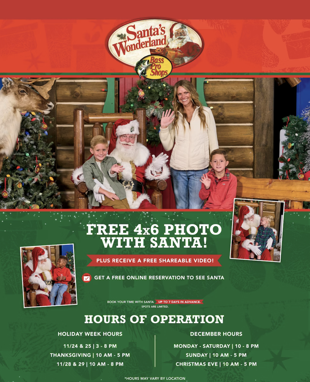December 1 – 24, 2025 – Santa’s Wonderland – In stores now at Bass Pro Shops Katy with free activities & giveaways! Free 4×6 photo with Santa,