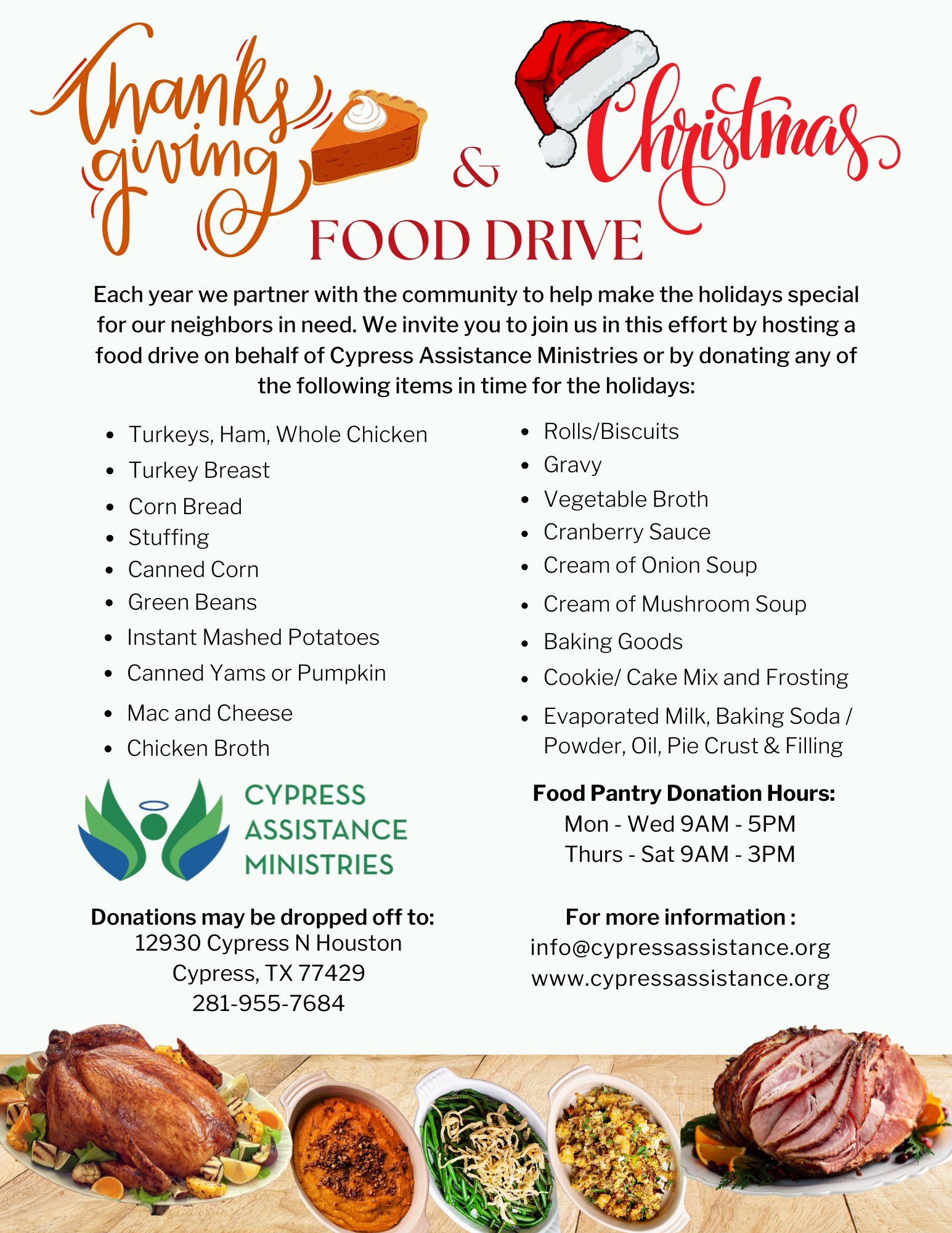 Now – December 12, 2025 – Thanksgiving and Christmas Food Drive – The Cypress Assistance Ministries Thanksgiving and Christmas Food Drive is collecting donations through