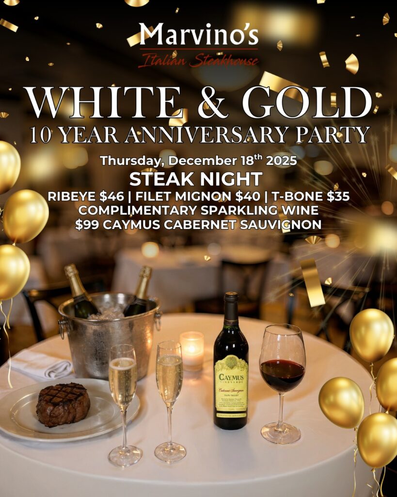 December 18, 2025 – Marvino’s White & Gold 10 Year Anniversary Party – Marvino’s Italian Steakhouse is celebrating a decade of unforgettable nights with its