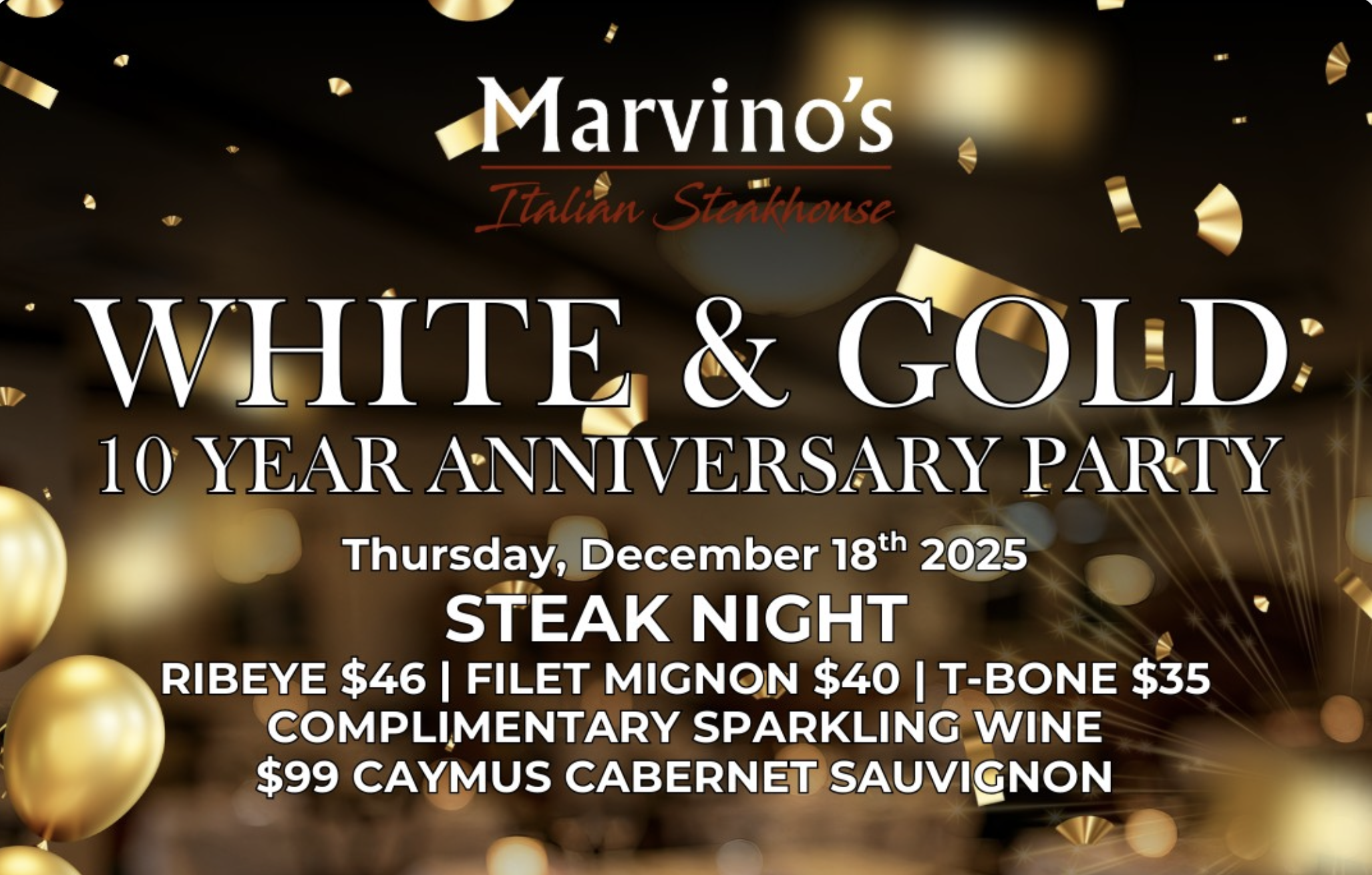 December 18, 2025 – Marvino’s White & Gold 10 Year Anniversary Party – Marvino’s Italian Steakhouse is celebrating a decade of unforgettable nights with its