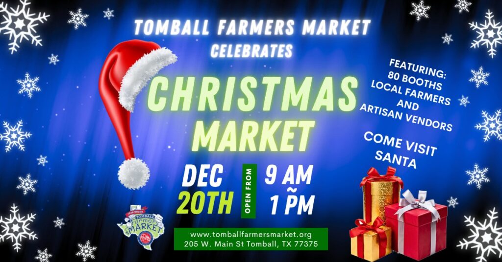 December 20, 2025 – Tomball Farmers Market Christmas Market – Get into the holiday spirit at the 17th Annual Christmas Market at Tomball Farmers Market on December