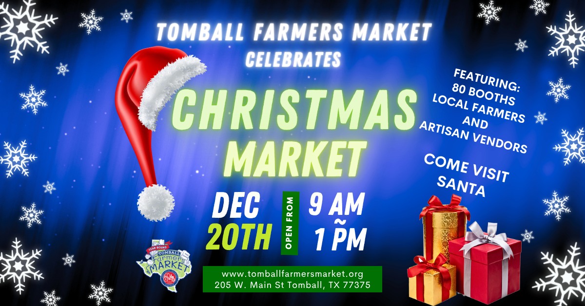 December 20, 2025 – Tomball Farmers Market Christmas Market – Get into the holiday spirit at the 17th Annual Christmas Market at Tomball Farmers Market on December 20, 2025, from 9 AM to 1 PM! Shop local for unique, last-minute Christmas treasures, bring the kids to visit Santa, and make magical memories in Old Town Tomball. Enjoy community cheer, holiday fun, and all the local goodness in one festive spot! Learn More