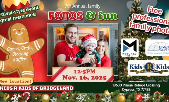 November 16, 2025 – 7th Annual Family, Fotos & Fun – Family, Fotos, And Fun is back for the 7th year! Come and join us Sunday, November 16th from 12-5pm for your FREE family Christmas photo at Kids ‘R’ Kids Learning Academy of Bridgeland 18630 Prairie Refuge Crossing, Cypress, TX 77433! We will also have a drop box for a toy drive, so bring your new, unwrapped toys and donate. Show up in your Christmas attire and get in line to let us take a professional photo of you and your family. Learn More