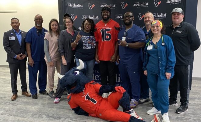 Houston Methodist Willowbrook Hospital recently welcomed a special visit from Houston Texans Wide Receiver Quintez Cephus and the team’s beloved mascot, TORO, who stopped by to show appreciation for hospital employees and their continued support throughout the football season. As the official health care provider of the Houston Texans, the hospital’s partnership with the team reflects a shared commitment to community, care, and gratitude.