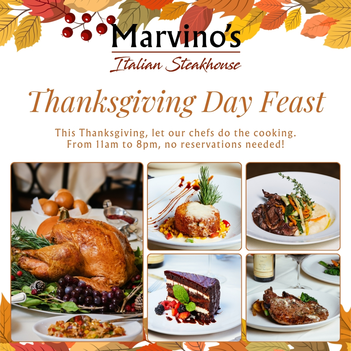 Marvino’s Italian Steakhouse will welcome guests for a festive Thanksgiving celebration on Thursday, November 27, 2025, from 11 AM to 5 PM. This year, diners can enjoy a special reduced menu featuring Marvino’s signature Italian-inspired entrées, classic favorites, and seasonal dishes prepared with holiday flair.