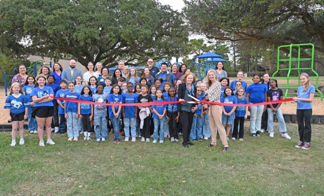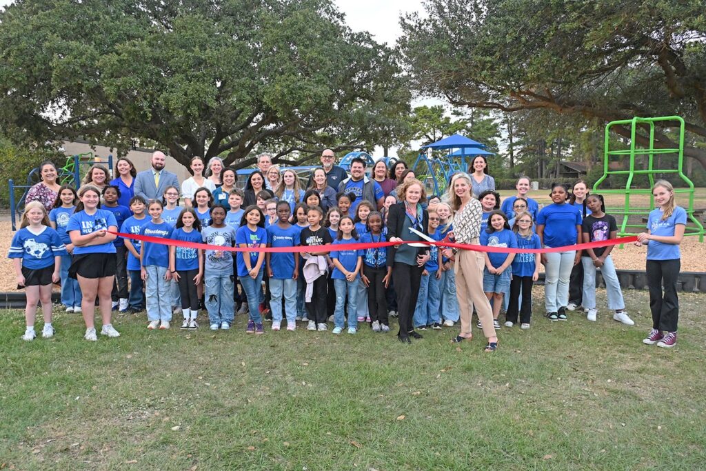 Joy Dauphin, Millsap Elementary School principal and Elizabeth Howley, SPARK executive director, pose with Millsap students at the new SPARK School Park playground ribbon cutting ceremony on Nov. 19. Photo Credit: CFISD