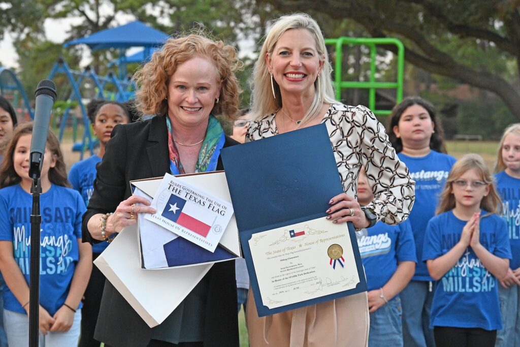 Elizabeth Howley, SPARK executive director, left, and Joy Dauphin, Millsap Elementary School principal, right, hold official SPARK park dedication certificate and The Texas Flag from the Texas House of Representatives to commemorate the dedication of the new SPARK Park playground at Millsap on Nov. 19. Photo Credit: CFISD