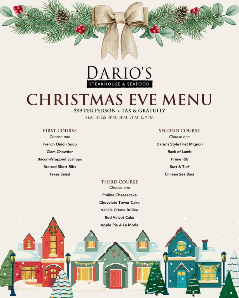December 24, 2025 – Christmas Eve Menu at Dario’s Steakhouse & Seafood – This Christmas Eve, let us do the cooking. Join us at Dario’s for a relaxed and memorable holiday dinner filled with great food, great drinks, and good company. Spend less time in the kitchen and more time enjoying the evening. Reserve Your Table Today