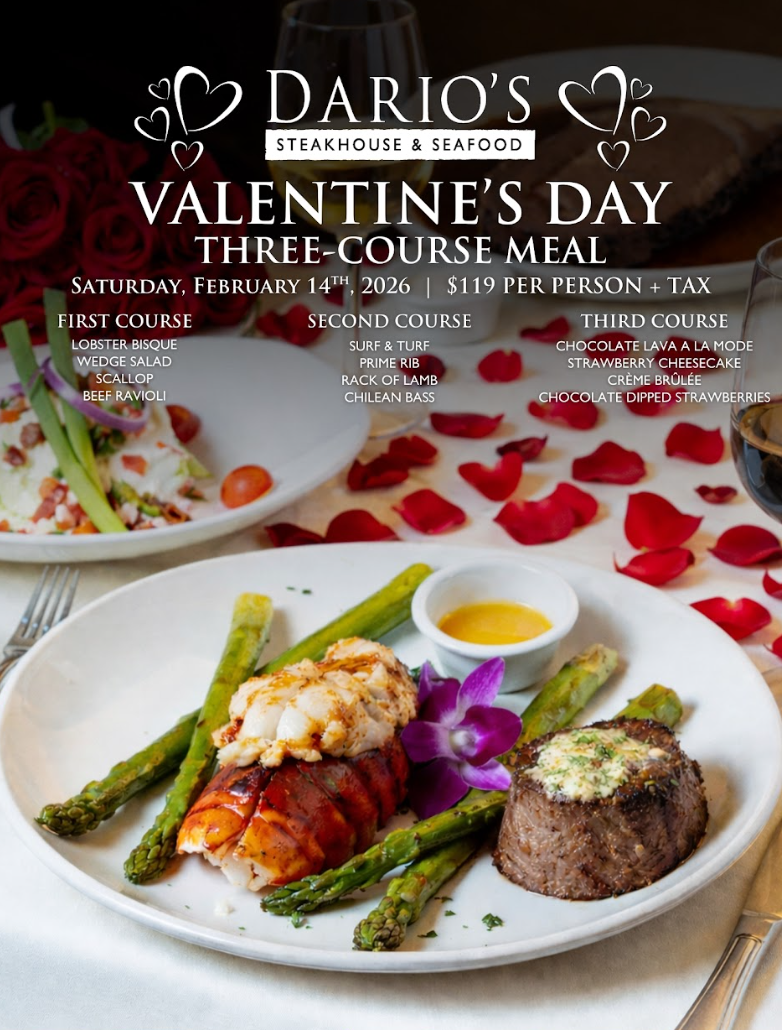 February 14, 2026 – Valentines Day Dinner – Celebrate Valentine’s Day at Dario’s Steakhouse & Seafood with an elegant three-course dinner available Saturday, February 14, 2026, at 3:00 PM, 5:00 PM, 7:00 PM, and 9:00 PM. Priced at $119 per person plus tax and gratuity, this special menu features indulgent starters like lobster bisque, seared scallops, or house-made beef ravioli, followed by standout entrées including surf and turf, prime rib, filet mignon Oscar, or Chilean bass. End the evening on a sweet note with decadent desserts such as chocolate lava cake, crème brûlée, or chocolate-dipped strawberries. Walk-ins are welcome, but reservations are highly encouraged, and the full meal is also available for takeout. Reserve Your Table