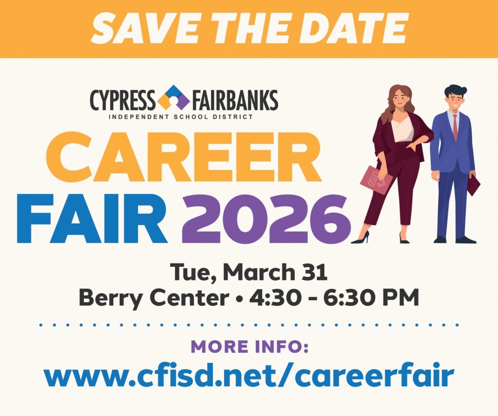 March 31, 2026 – CFISD Annual Career Fair – Cypress-Fairbanks ISD invites all applicants interested in both professional and support positions to attend the Annual CFISD Career Fair on March 31, 2026, from 4:30–6:30 p.m. (doors open at 3:45 p.m.) at the Berry Center, Entrance Two (8877 Barker Cypress Road, Cypress, TX 77433). This free event offers a valuable opportunity to meet campus administrators and department leaders and learn more about career opportunities within CFISD. Attendees are strongly encouraged to complete an application through the district’s Applicant Tracking System in advance and upload their resume, certification, and transcripts. Applicants should bring a copy of their resume (teachers and administrators should also bring their certificate or ACP letter) and dress professionally. Learn More