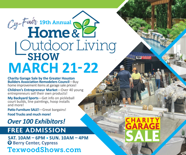 March 21 & 22, 2026 – Transform your home and outdoor living space at the 19th Annual Cy-Fair Home and Outdoor Living Show March 21-22 at the Berry Center with special guest appearances and over 100 exhibitors with the latest home improvement products and services on the market. The Greater Houston Builders Association Remodelers Council is hosting the 17th annual Charity Garage Sale at the show sponsored by the Greater Houston Builders Association (GHBA) with brand-new and gently used home products, including appliances, lighting fixtures, cabinets, hardware, ceiling fans, sinks, tiles, select furniture and so much more! Everything is discounted to “garage sale” pricing with all proceeds going to Houston-area charities. Admission is FREE! Learn More