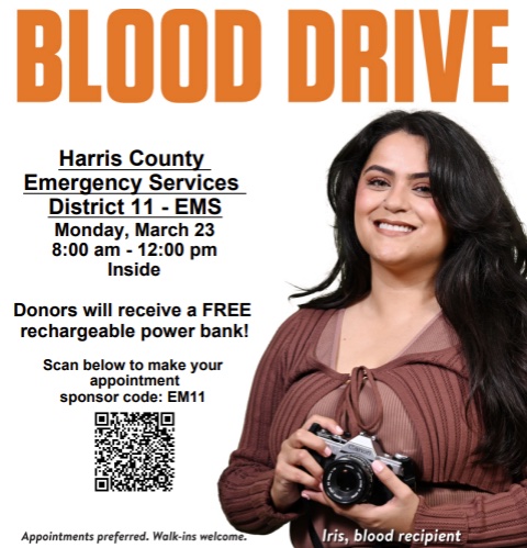 March 23, 2026 – Harris County ESD 11 Blood Drive – Harris County ESD 11 is taking a major step forward in emergency care by beginning to provide life-saving plasma to patients experiencing significant blood loss before they reach the hospital — and you can help make it possible. Join the upcoming blood drive on Monday, March 23, from 8:00 a.m. to 12:00 p.m. at the Main Administrative Campus located at 18334 Stuebner Airline Road, Spring, TX 77379. Donors are asked to bring a valid ID and will receive a FREE rechargeable power bank as a thank-you for helping save lives. Learn More